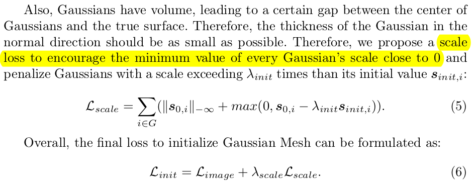 5) scale 이 자유도가 3인데 flat Gaussian, 거의 2D gaussian으로 만들어야 mesh face에 달라붙을 확률이 높으므로 3자유도 중 가장 값이 작은 (eigenvalue가 가장 작은) 값이 0이 되도록 강제해준다. |