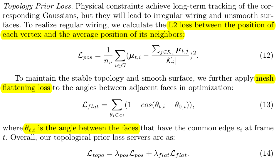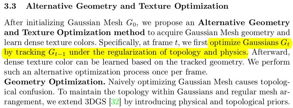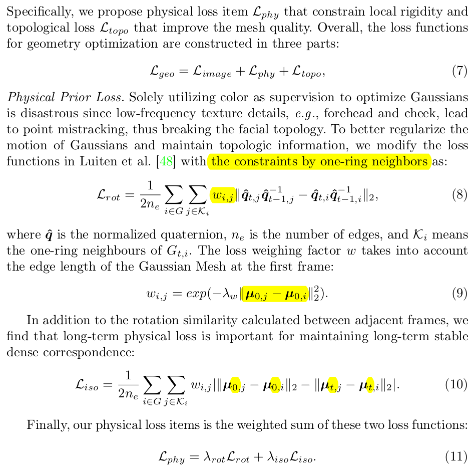이후 과정은 연쇄적으로 tracking 하듯이 다음 프레임 3DGS 상태를 최적화하는 것 1) geometric 하게 최적화 (1000 iter) 2) texture를 위한 최적화 (300 iter) 번갈아하는 방식이다. 동시에 하면 망가지기 때문에 이렇게 따로 한 듯하다 -> positional, rotation, scale을 먼저 최적화 하는 느낌. --------------- 1) geometric 최적화 할때 one-ring neighbor랑 rotation (normal) 차이가 이전 프레임과 같도록 -> 이전 프레임 대비 face가 확확 돌아가지 않도록 -> vertex 간 거리로 weight. 멀수록 작고 가까울수록 크게 초기화했던 mesh에서 vertex 간 거리가 프레임 t일 때도 최대한 유지되도록 |