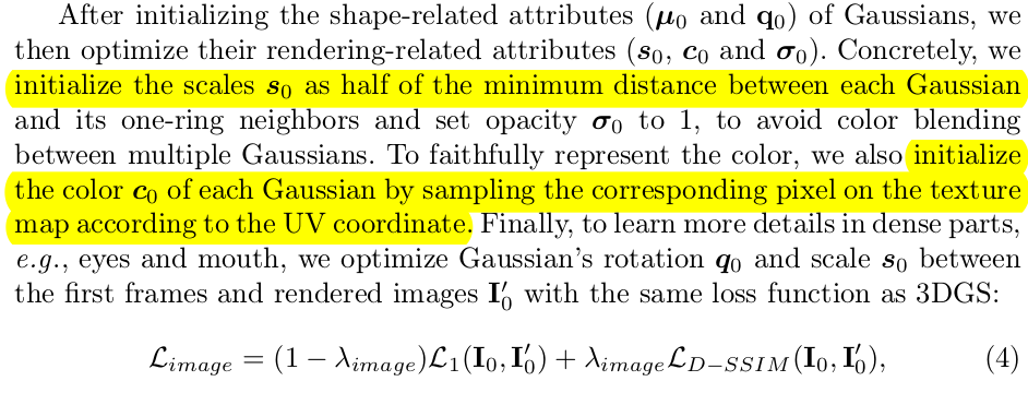 핵심이 되는 내용은 안정적으로 GS를 매 프레임 최적화할 수 있도록 넣은 scale loss, prior loss 들이다. 마지막에 3DGS color -> texture map으로 옮겨서 텍스처도 얻을 수 있다.