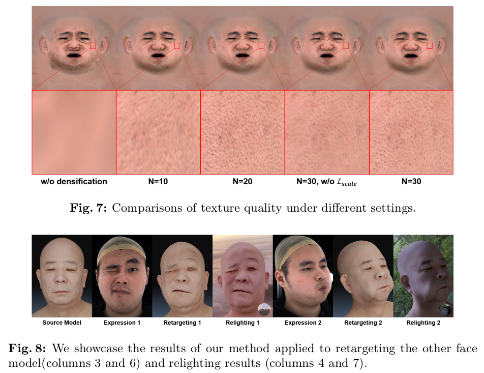 2) texture 업데이트할 때는 기존 topology vertex 개수만큼만 GS를 사용하면 절대 8K 해상도는 못만들기 때문에 geometric optimization (이전 1000iter)에서 찾은 3DGS 위치를 고정해두고, UV cooridnate 상에서 N번 densification한다. -> 사실 상 8K texture map 해상도로 3DGS를 더 부여하는 것 -> 그러고 최적화 |