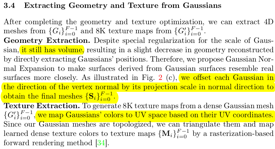 매프레임 최적화가 다 끝나고 나면 1) geometry는 각 gaussian position을 꺼내고 face 대로 묶어주면 됨 -> 하지만 gaussian scale이 2D가 되도록 강제하긴 했지만 완벽히 2D, scale 0이 되진 않음 -> normal 방향으로 minimul scale만큼 강제 이동시켜서 후처리하는 식으로 보정 2) texture 는 8k texture map 해상도로 3DGS를 추가 생성해서 color를 찾아놨기 때문에 UV texturemap pixel마다 3DGS를 찾아가 RGB 값을 읽어오는 식으로 간단히 생성했다. |