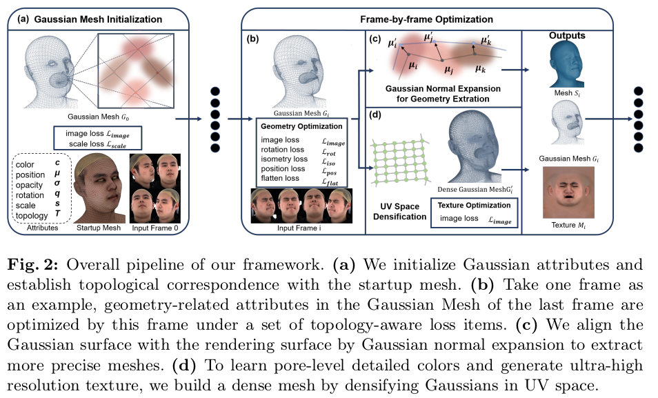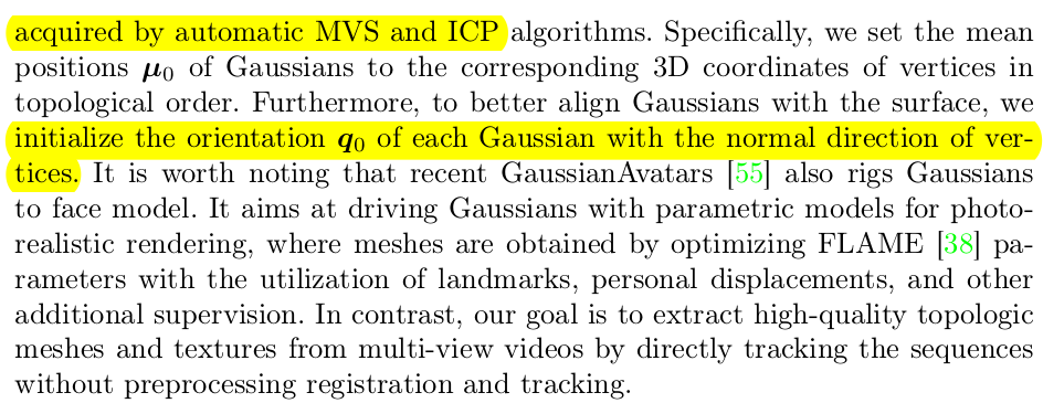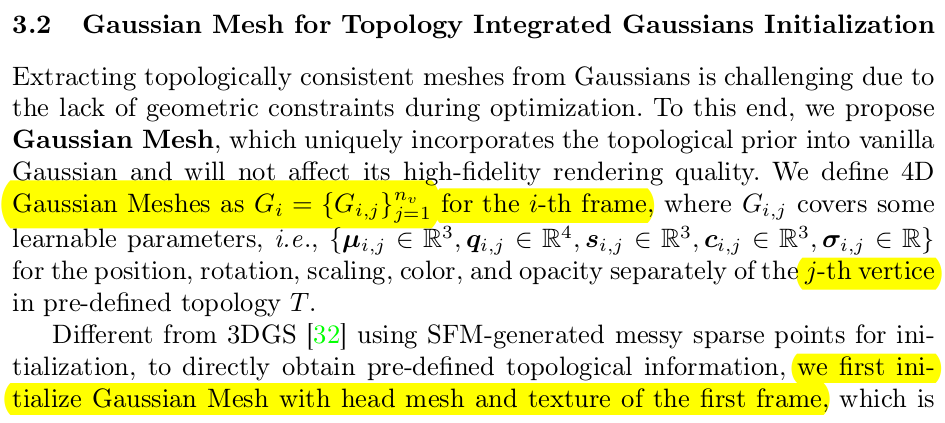 Multiview video -> uniform topology Gaussian Mesh per frame 논문. 캘리브레이션/싱크 완벽한 카메라 세팅에서 찍은 비디오가 준비된 상황에서 첫 프레임만 MVS+Registration으로 gaussian mesh 초기화하고 이후부터는 tracking 하듯이 움직여서 나머지 프레임을 찾는 방식이다.