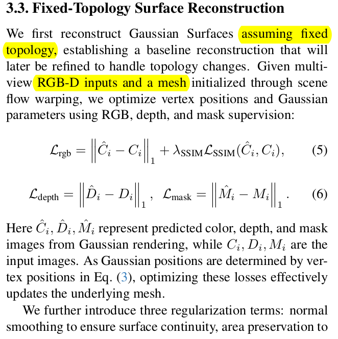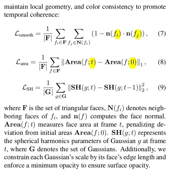 ![]() 다음 프레임부터는 수렴시킬 때 3D correspondence는 찾아놨다는 전제 하에, correpondence끼리 normal이나 면적, SH가 비슷하도록 regularization하는 term만 추가됨. -> 3DGS를 수렴시키는 부분은 vanilla 3DGS랑 거의 동일. |