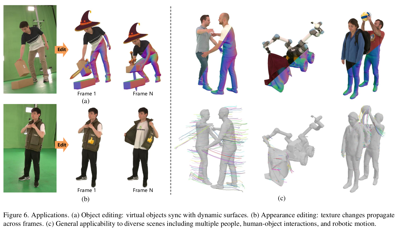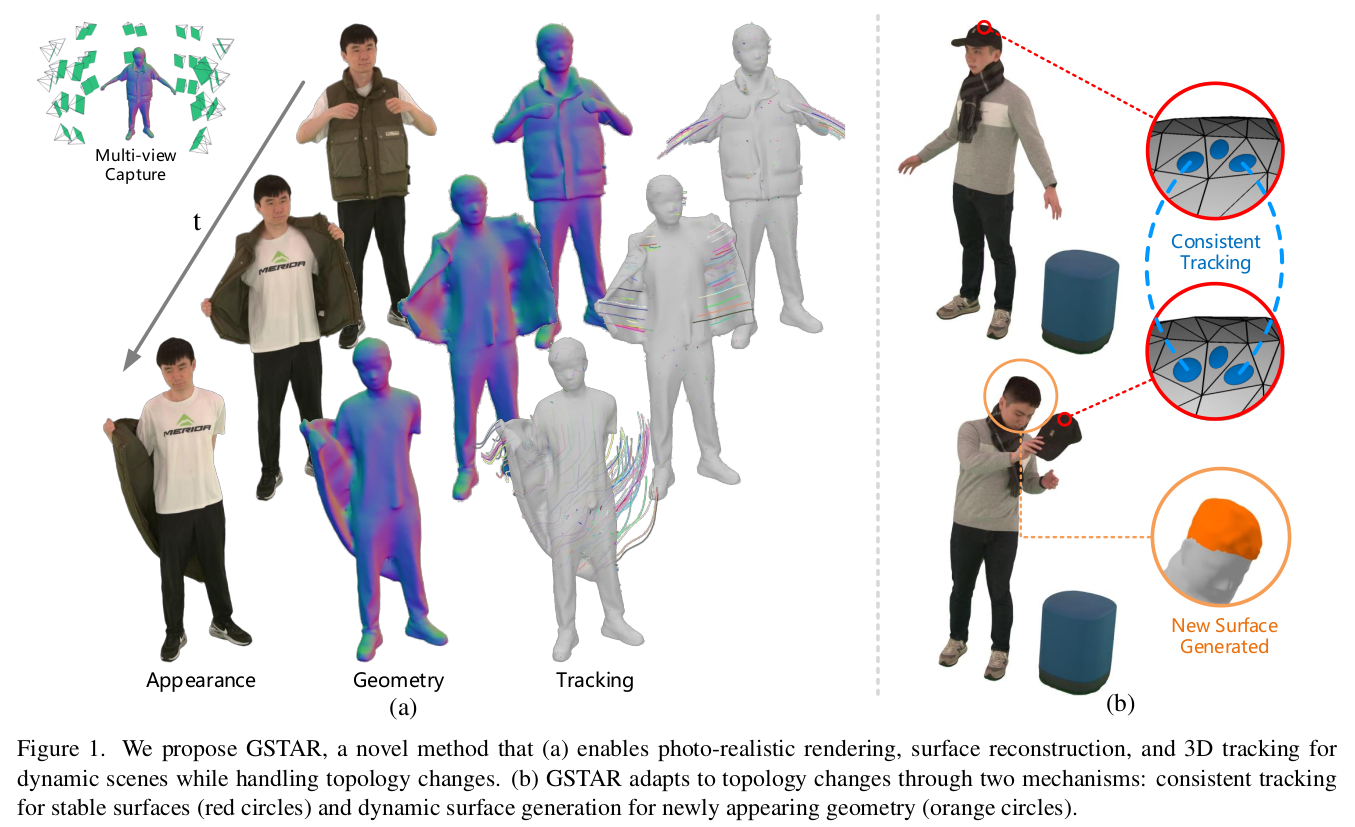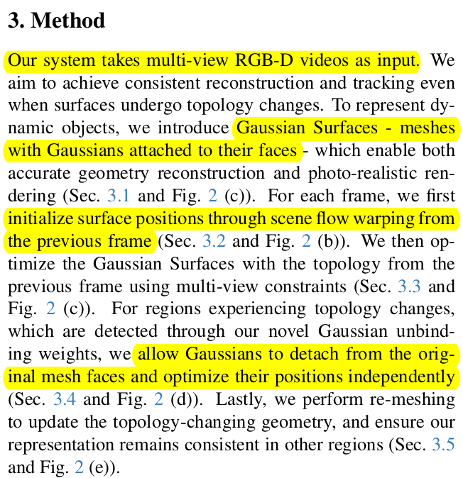 RGB-D multiview video 셋업에서 tracked 3DGS 복원하는 논문. tracking이 꼈다는 것은 당연히 dynamic 시나리오. 보통 sequence를 다룰 때 이전 프레임에서 초기화한 mesh(혹은 3DGS) topology가 변하지 않는다는 가정 하에 다음 프레임에서 correspondence를 찾아가는 방식이지만, 이 논문은 다음 프레임에서 topology가 변할 수 있음을 추가한 것이 눈에 띈다.