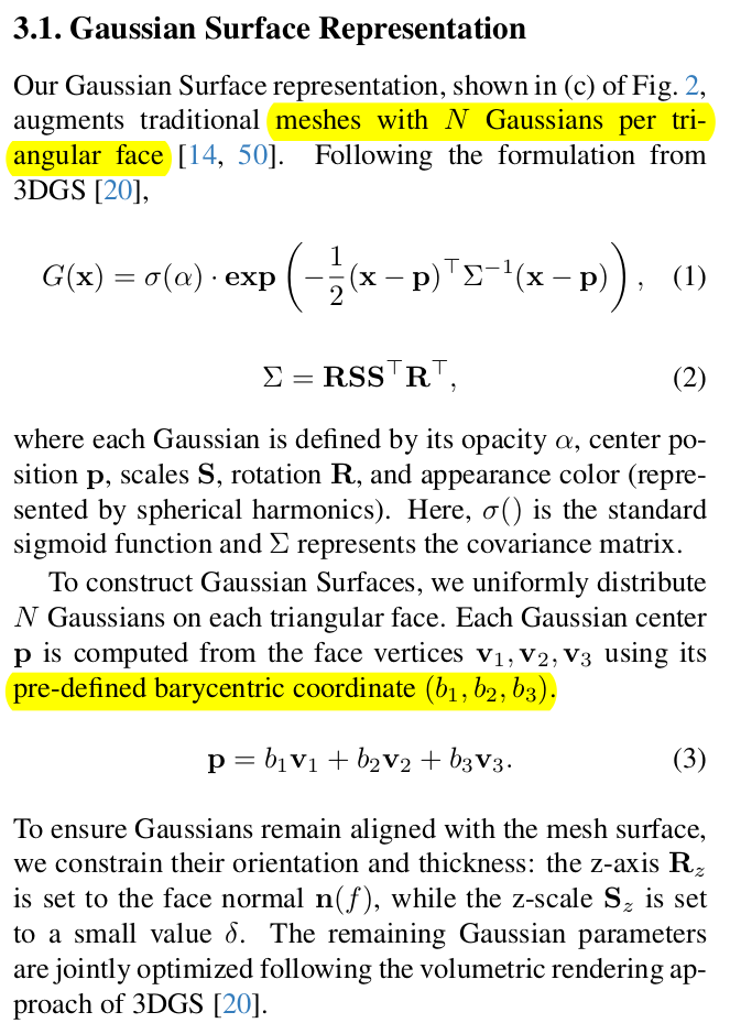 초기화 시에 각 mesh face마다 3DGS를 할당 N개 할당했다고 하는데, TSDF fusion 결과로 mesh를 얻었을 경우 mesh가 엄청나게 dense할테니 N=1 썼지 않을까. |