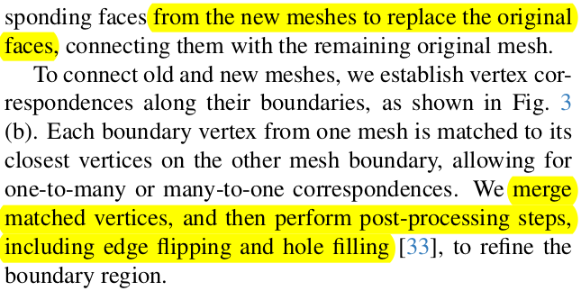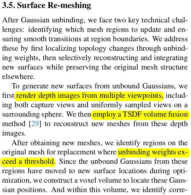 ![]() 경계 부분에서 positional gradient를 기준으로 분리해야 된다고 인식도 했고, 3DGS 추가 생성도 해줬다. 그럼 어떻게 분리된 이후에 새로 생성된 3DGS는 어떻게 새로운 face를 생성할까? 이부분도 상당히 heuristic하다. 쌩뚱맞게 TSDF fusion을 돌려서 mesh를 얻어 둔 것을 다시 불러와서 densified 이전 프레임 <-> 다음 프레임 TSDF mesh 이렇게 두개 간에 거리를 보고 하나씩 하나씩 덮어쓰기 해주는 것. 단순히 말하면 새로 생성된 3DGS를 face로 묶어주는 연결 관계는 TSDF mesh에서 가져온다는 뜻. -> 이렇게 무식하게 하다보면 face 뒤집히고 edge 뒤집히고 난리나는데 -> 이것도 그냥 mesh postprocessing 돌려버림. |