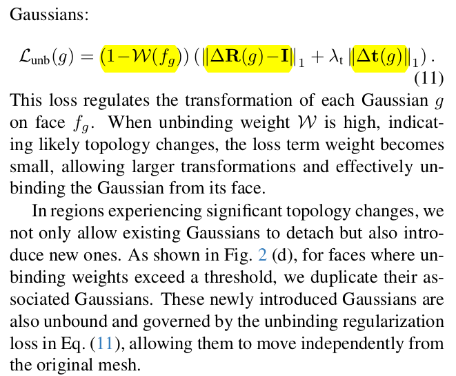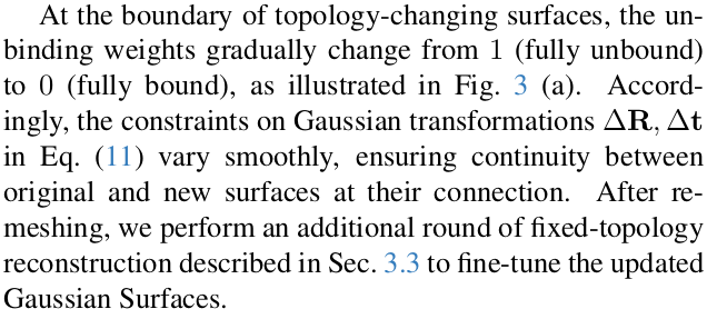 ![]() densification 해서 3DGS가 특정 경계에서 추가된다면 뒤에 re-meshing에서 새로이 face를 구성해줌 -> 분리된 새로운 topology가 생성됨. ![]() ![]() residual 값은 0에 가까워야 하고 불필요한 상황에서는 항상 0인 것이 이상적이므로 regularization 추가는 당연히 필수 positiona gradient가 클 때는 residual도 커야 하니 1- W로 weighting |