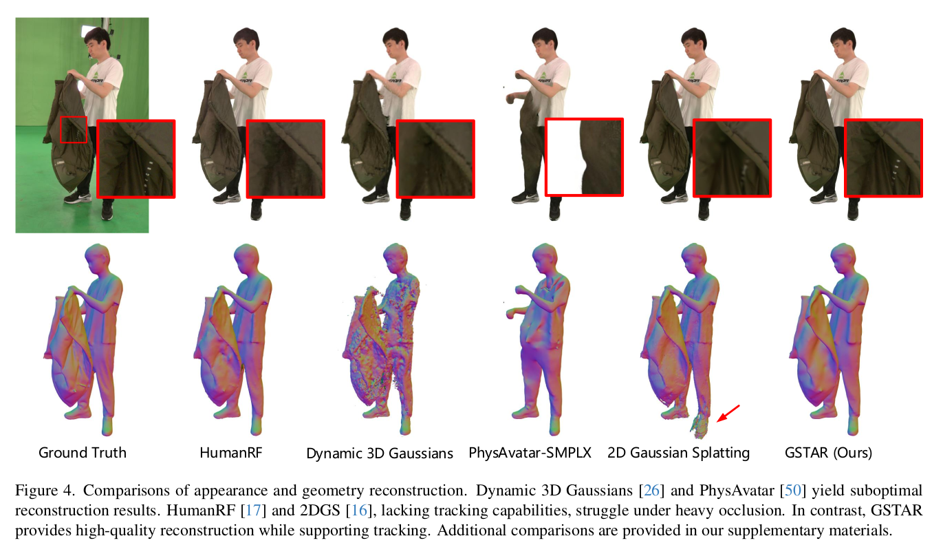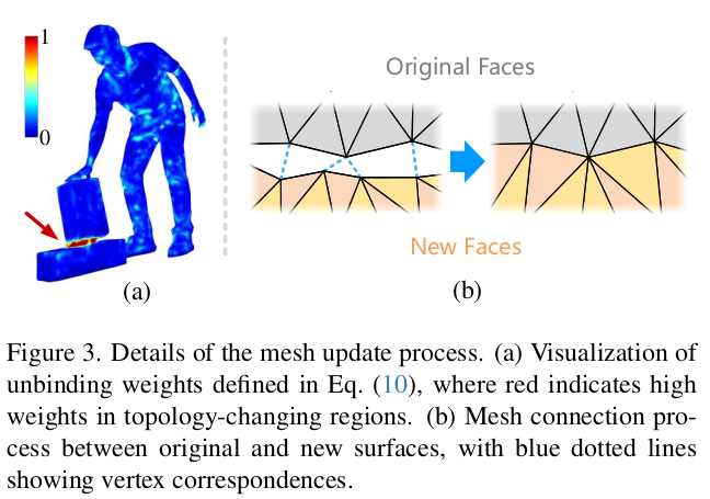 예를 들어, 첫 프레임에서 모자를 쓰고 있었다가 어느 프레임에서 모자를 벗었다면, 모자로 가려졌던 부분은 기존 topology로 아무리 매칭을 해본들 없던 부분이라 못 찾는다. 이런 문제를 짚으면서 topology가 변해야 하는 부분을 인식하고 해당 부분에 3DGS를 추가해주는 방식을 넣어서 보다 자연스럽고 변형이 많은 상황에서 더 성능이 좋다.