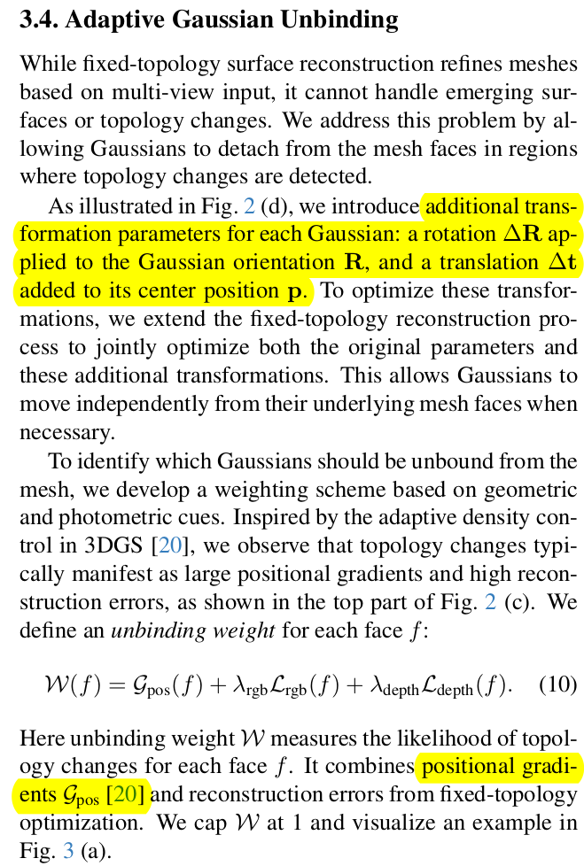 ![]() 여기가 좀 핵심. 3dgs를 MESH FACE에 묶어두었으니 densification은 없다. 따라서 positional gradient를 이용할 일이 없다고 생각했을 수 있는데, 다른 방향으로 이를 topology가 변해야된다는 시그널로 생각함 (이 부분이 생각이 참 좋음) rotation/translation은 face에 묶여있으니 그대로 두고, delta rotation/translation을 파라미터로 추가하고 이것들의 gradient를 관찰한다. residual로 인해 발생하는 gradient가 일정 threshold 이상일 경우, densification을 수행해준다. |
