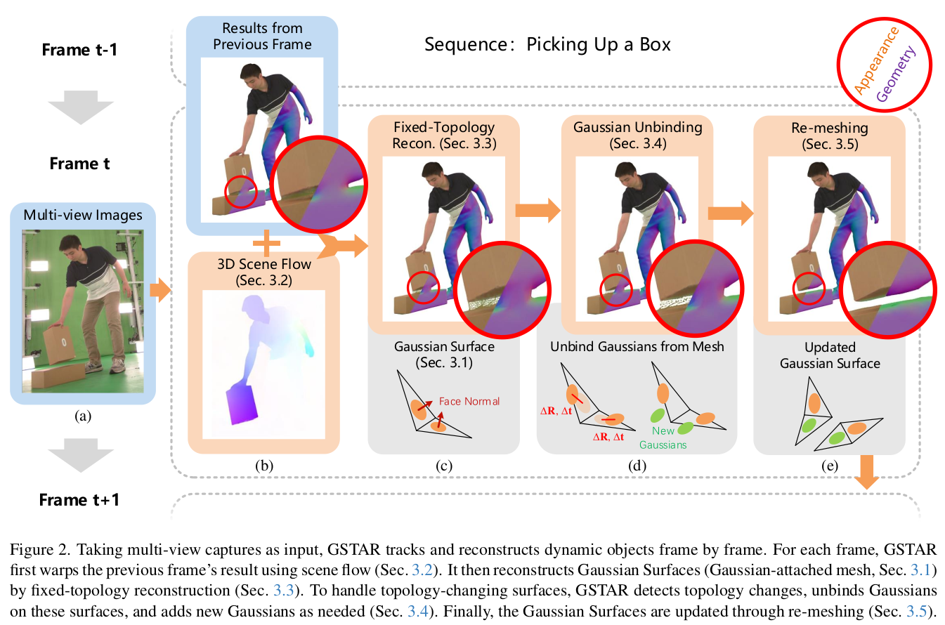 1) 첫프레임에서 mesh (MVS나 TSDF fusion 여기서는 RGBD니까 후자였을 듯) 초기화 + face 마다 3DGS 할당 2) 다음 프레임과 이전 프레임 간 correspondence search -> multiview 이미지 전체에 대해 2d optical flow를 계산 -> flow backprojection을 전부 다 하고 가장 cost가 적은 matching이 correspondence 3) 각 face 3DGS 마다 position gradient, color gradient를 계속 관찰 (Rotation residual, translation residual 변수를 추가하고 얘네들이 클 경우를 유의) -> gradient가 큰 3DGS는 분리가 필요한 (모자같은 ) 부분이라고 인식 -> 해당 부분은 densification 수행. 4) 반대로 3DGS 병합이 필요한 경우는 gradient로 처리하지 않고, 나중에 re-meshing 단에서 euclidean distance 기반으로 계산하고, post-processing 으로 merging 해줌. (굉장히 heuristic) |