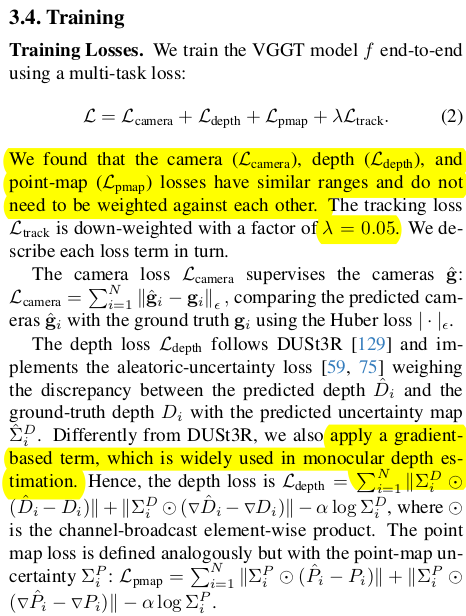 ![]() | ![]() loss는 최고 단순하다. HUBER LOSS를 썼다는 사소한 점을 빼면 단순히 distance 기반 loss로 최적화했다. depth, point map는 raw vs GT normalization 없이 박치기 했다. (데이터 셋이 엄청 커서 가능한 듯) gradient term이 하나 추가 되어서 smoothness를 챙긴 점만 차이점. |