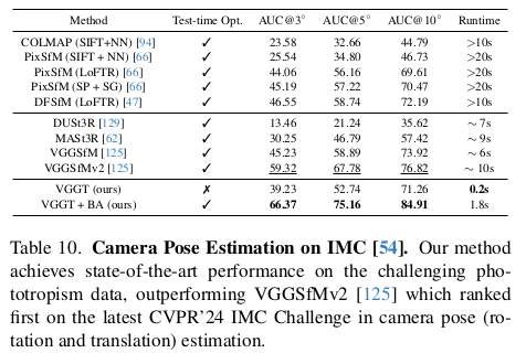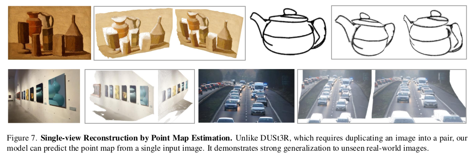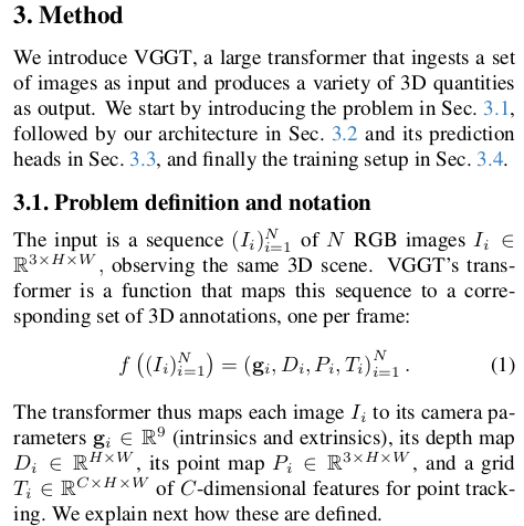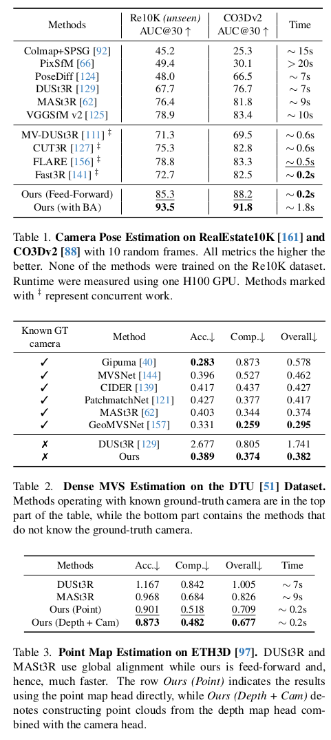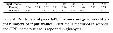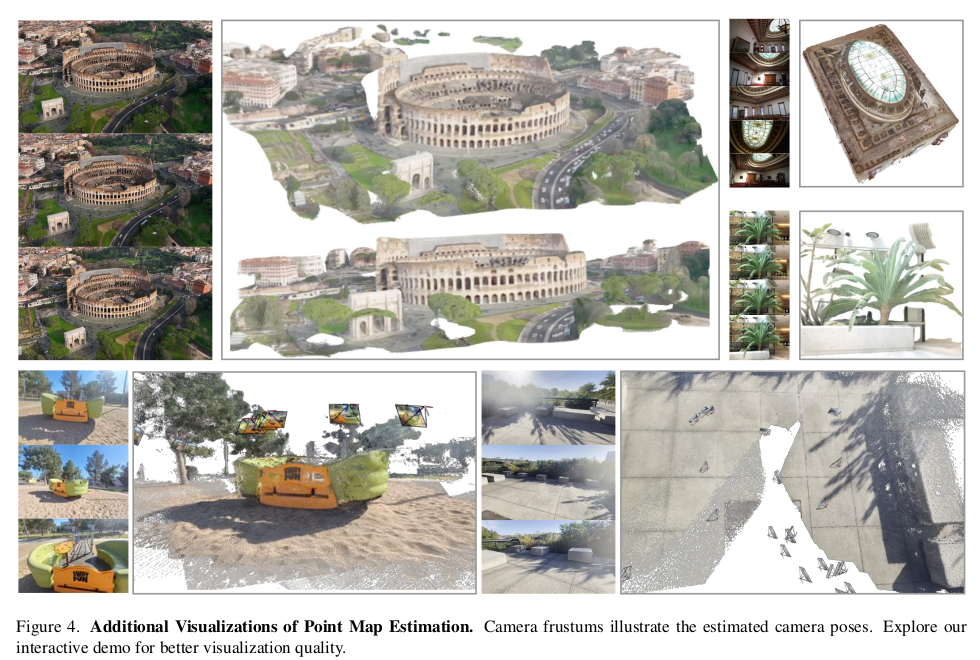 head에 따라 camera parameter, point map, depth map, feature point 등 동시에 예측할 수 있고, 수백장을 동시처리하는 성능을 보인다고 한다. 핵심은 DUST3R와 거의 유사하지만, backbone을 transformer 1개로 묶어버림으로써 N장 처리 능력을 확보하고, 어떤 구조가 좋을지 고민했다는 점이 차이점.