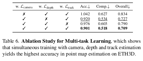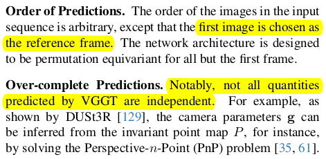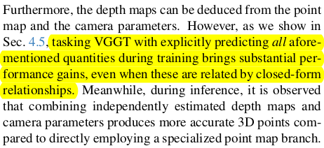 ![]() ![]() | 첫 프레임이 무조건 처음으로 들어가고, 특별 대우함. 첫 프레임이 reference가 되기 때문. 뒤에 추가되는 token들도 첫 프레임 것들은 독립적으로 구성했다. ---- head를 보면 camera parameter는 point map을 역추정할 수 있고, point map은 camera parameter와 depth map으로 추정할 수 있는 서로 얽힌 관계임에도 별개로 head를 만들어 두었다. closed-form으로 얽힌 문제를 굳이 독립적인 것 마냥 head를 구성한 이유는 단순히, 이렇게 하는게 성능 gain이 있었기 때문 --- depth map + camera params > point map 성능 구도가 나온다고 짧게 적어주기도 함. |
