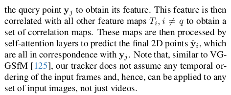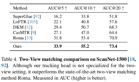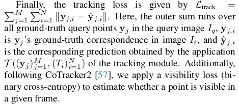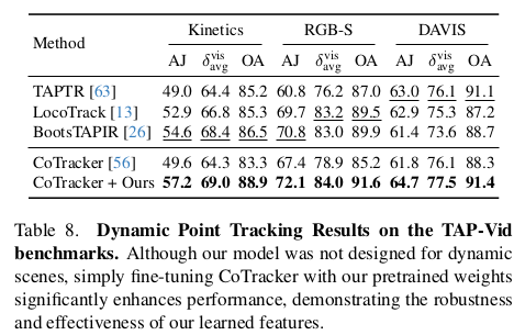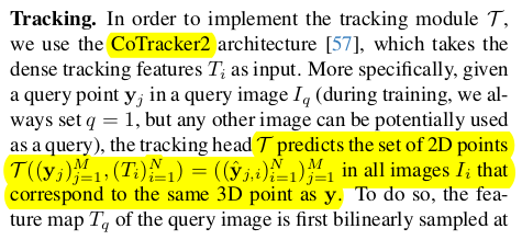 ![]() ![]() 카메라 파라미터는 fx, fy (cx,cy는 이미지 중심으로 가정해서 생략), quaternion, translation 이다. depth map은 normalization 없이 그냥 통째로 학습함. [0, inf) 범위로 그냥 학습. 데이터셋 규모를 키워서 해결하는 방법. | ![]() 새로운 downstream task로 keypoint tracking을 들었다. 약간 feature matching head 같은건데, query y에 대해서 N-1장 내 correspondence를 찾는 문제를 tracking으로 풀었다. Cotracker2에 입력으로 넣을 수 있는 feature map을 출력으로 내도록 했다. |