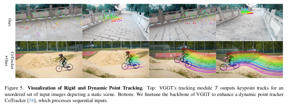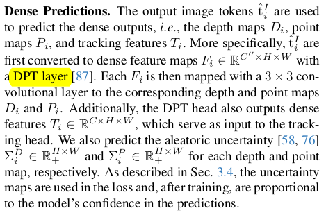 ![]() depth map, point map, feature map은 전부 DPT를 붙여서 예측 DPT를 각각 붙인게 아니다. DPT 1개가 모든 걸 채널 방향으로 한번에 예측 (이게 잘되네...) | ![]() ![]() DPT 결과 중 feature map에 해당하는 채널부터는 잘라내서 뒤에 CoTracker2(transformer 기반 feature matcher)에 입력으로 넣는다. DINOv2 + VGGT + DPT + CoTracker2까지 한번에 학습한셈.... 엄청 거대하다. |