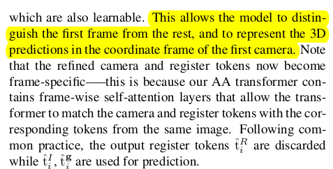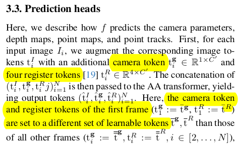 ![]() ![]() | 카메라 파라미터를 예측할 때는 camera token 1개 register token 4개 ( 그냥 dummy token이고 학습 끝나고도 그냥 무시하는 token인데, 이렇게 여분을 넣어두면 성능이 뛴다는 meta 논문이 있기 때문에 추가한 것) image token k 번째 시점 1개 가 입력이다. |