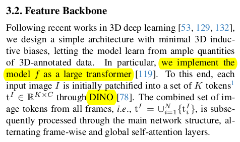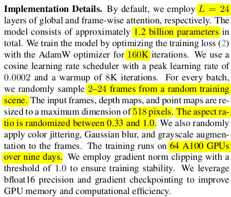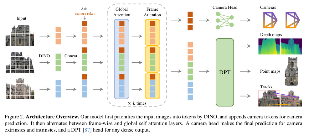 ![]() | 이미지 N장을 DINOv2를 통해 token화 하고 입력으로 받는 구조. 초거대 Transformer 1개가 본체. 뒤에 DPT를 붙이면 dense prediction이 필요한 depth map, point map, feature map이 나오고 MLP를 붙이면 camera parameter 가 나오는 방식 동시에 학습했다. -> 덩치가 어마어마하게 크고 64 A100으로 9일 학습시켰다고 할 정도. |