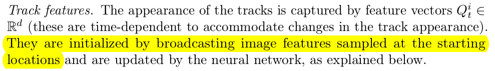 tracked feature라고 query point 개수만큼 learable feature를 만들어 둚. - 그냥 image feature에서 grid-sample해서 쓸 수도 있지만 그러면 첫 프레임에 bias가 걸리니까. point feature마다 지속적으로 업데이트되고 수렴할 수 있도록 learnable로 열어두는 방식. 초기화를 첫 프레임에서 grid-sample 하는 것으로 함. |