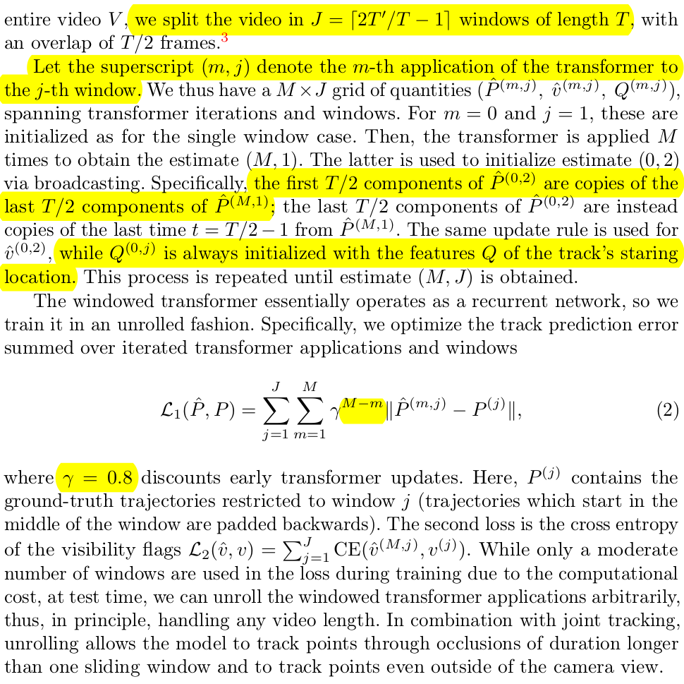 학습은 당연히 비디오로 하는데 (GT가 있는 synthetic video) 메모리의 한계 상 T 프레임씩 끊어서 학습을 해야만 함. 이 때 전체 길이 T' 을 T단위로 나눈다음 그룹 0학습은 그대로 하고, 그룹1 학습할 때는 그룹0 최종 결과를 초기값으로 쓰는 방식으로 꼬리 물도록 디자인해서 학습했다고 함. --- loss는 transformer가 M번 반복 해서 attention할 텐데, 초반에 loss weight를 크게 주고 후반에는 낮춰서 처음부터 잘맞추도록 scale다운 해주고 L2 loss로 계산함. |