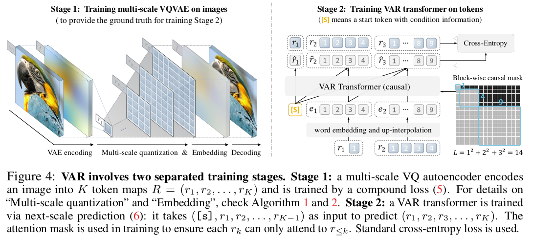 수식으로 적으면 가장 해상도가 낮은 coarse token을 입력으로 그보다 하나 더 해상도가 높아진 fine token을 예측하고, 이 둘이 또 입력으로 들어가서 그 다음. 그다음 해상도를 예측하는 방식이다. 여기서 K를 높일수록 고해상도로 학습 됨. --- block wise causal mask는 attention을 가할 때 이전 token은 masked out되고, 미래 token과만 연산되도록 하는 mask임 attention 마스크가 NxN인데 이중 일부가 0으로 되어있다고 생각하면 됨. weight matrix에 곱해버리면 순식간에 모든 attention이 masking됨. |
