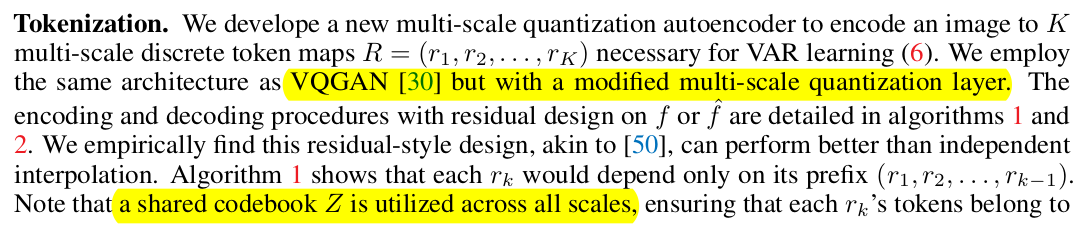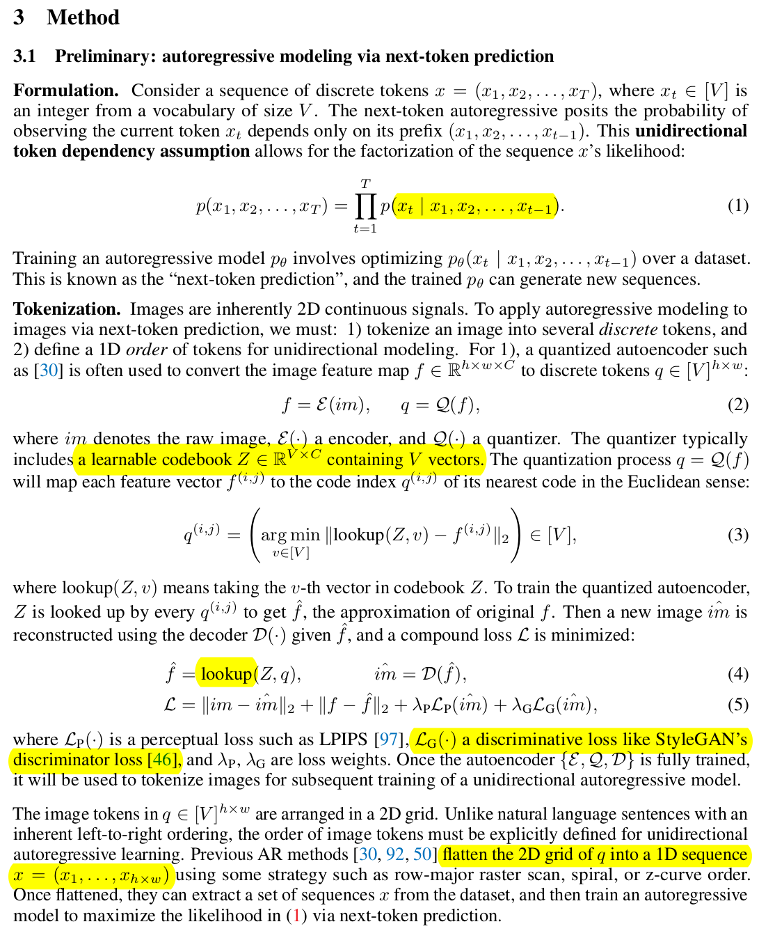 들어가기 전 배경지식 중 필요한 것은 구현할 때 image feature (token feature)를 VQGAN 처럼 vocabulary feature를 만들고 시작했다는 점. 이렇게 한 이유는, AR 모델은 이렇게 구성하는 것이 정석이라고 많은 논문들로 증명됐음. 따라서 그 컨셉을 그대로 물려 받기 위해 voca를 구성한 것. |