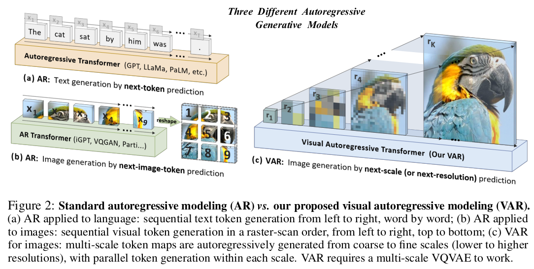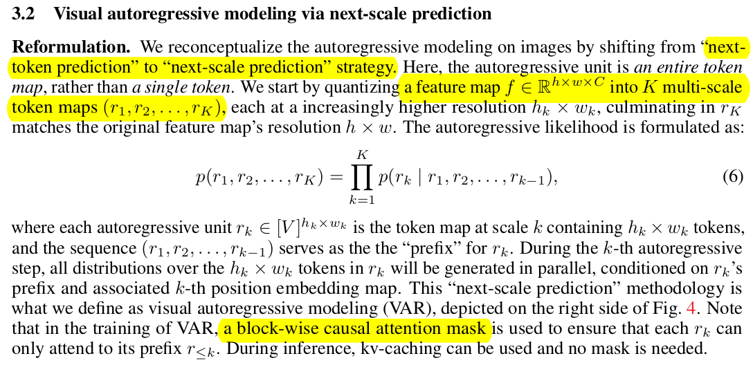 그래서 제안하는 컨셉이 이미지를 정해진 patch size로 토큰화 하는 것이 아니라 여러 scale patch로 토큰화 한다음, 작은 토큰이 이전 큰 토큰이 미래 라고 가정하고 coarse-to-fine autoregressive하게 푼다. 한 마디로 패러다임 쉬프트. (아주 좋은 듯) |
