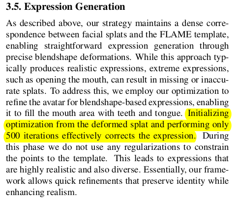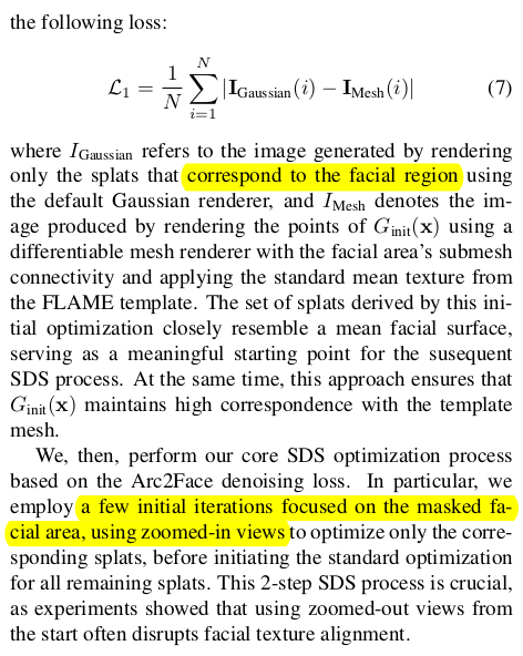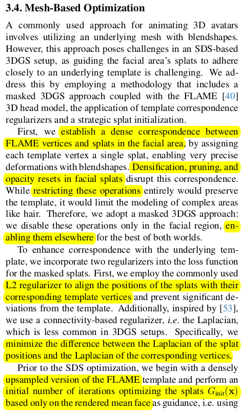 ![]() 1) FLAME vertex마다 3DGS 할당 ->facial region은 densification, pruning, opacity reset 금지 ->non-facial region은 자유롭게 열어둠. 2) vertex에서 멀어지지 않도록 regularization 3) laplacian regularizer로 표면 smoothness도 유지하도록 4) mean texture 로 얼굴 영역 색상 초기화 조금 ->zoom-in view 주로 사용. |