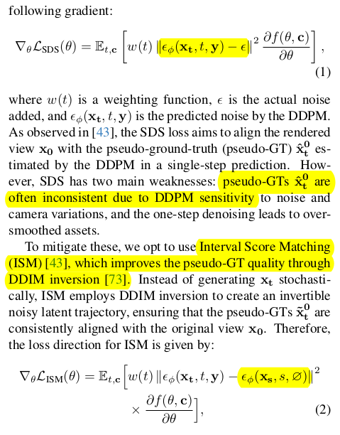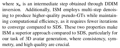 ![]() ![]() 1) SDS Loss 사용할 때 수식(1)처럼 기본 형태로 쓰면 성능이 조금 떨어진다고 함. sensitivity가 너무 높아서 튜닝이 너무 어렵다는 뜻으로 보임. -> 따라서 예측된 noise가 GT noise와 얼마나 차이나는지 직접 비교하는 방식이 아니라 예측된 noise의 "변화 방향"을 사용하는 ISM을 사용했다. ->이게 더 안정적이라는 연구가 있음. 2) arc2face는 알려진 그대로 가져다 씀. 해상도는 512x512. -> 뒤에서 LoRA로 head pose 에 대해 튜닝하는 정도. |