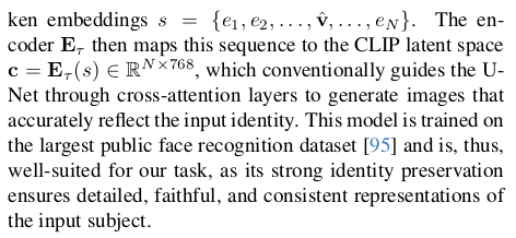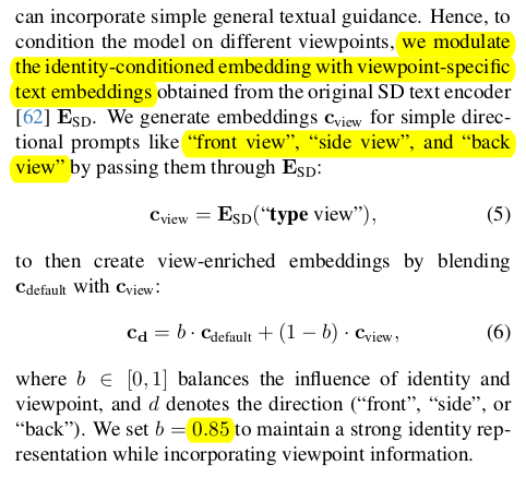 ![]() 기본적으로 condition은 arcface가 뱉어주는 ID embedding, v를 쓰는 것. arc2face 방식대로 arcface embedding을 "photo of a id person"이라는 문장 안에 껴넣는 식으로 token을 만들어서 사용하는게 default다. 하지만 이러면 현 렌더링된 이미지에 카메라 뷰 정보는 아무것도 없기 때문에 애매함. 그래서 front view, side view, back view를 texture encoder 통과시켜서 만든 token을 default token에 블렌딩해주는 식으로 섞어줌. ->이때 default가 85%가 되도록 블렌딩하는게 성능이 좋았다고 함. |