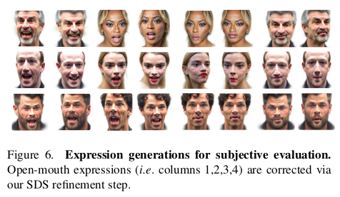 정해진 위치에 MEAN Texture를 가진 FLAME을 하나 놓고, 이를 특정 카메라 각도로 렌더링한 이미지에 대해 SDS loss를 계속 먹여주는 방식이다. 렌더링 결과에 대해, arc2face에게 주어진 ID 얼굴 같아? 를 계속 물어보면서 수렴시키는 방식. arc2face가 얼마나 잘 학습되어있느냐에 dependent할 수 밖에 없지만. 잘되는 것으로 보아 arc2face의 탄탄함도 동시에 증명됨. 완성된 결과를 FLAME에 얹어진 형태다 보니, 기존 blendshape 그대로 사용 가능. 변형 이후에 입 안이나, 눈, 머리 같은건 일그러질 수 있는데. 그 때 후처리 개념으로 SDS loss를 이용한 업데이트 500번 정도하면 또 자연스럽게 업데이트 된다고 한다. |