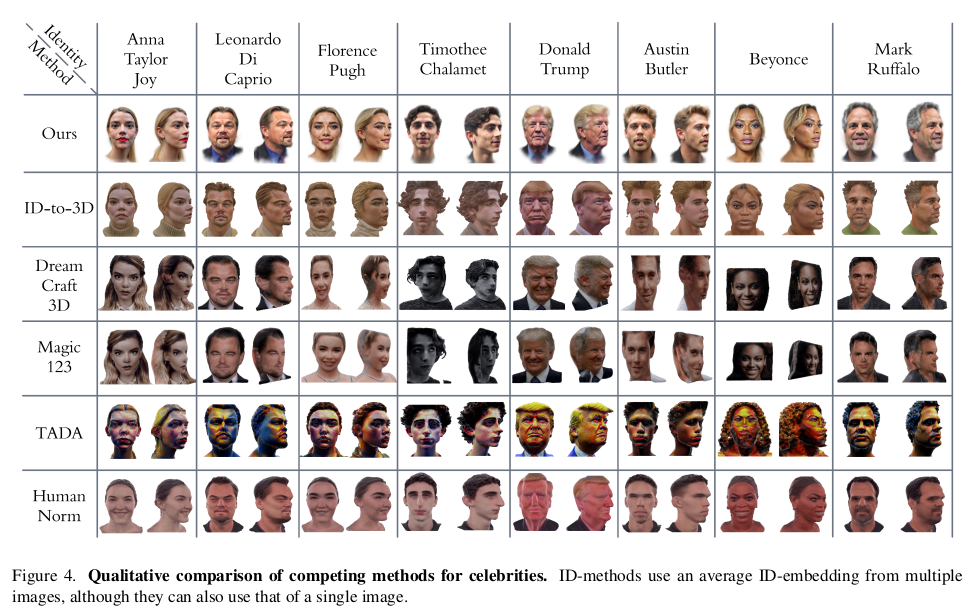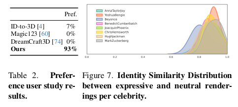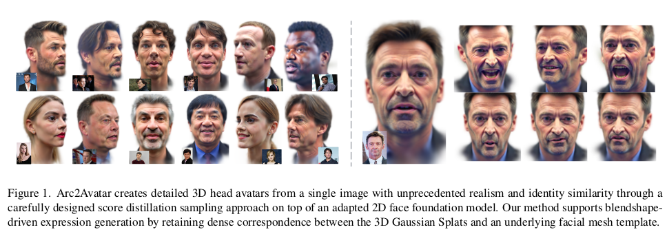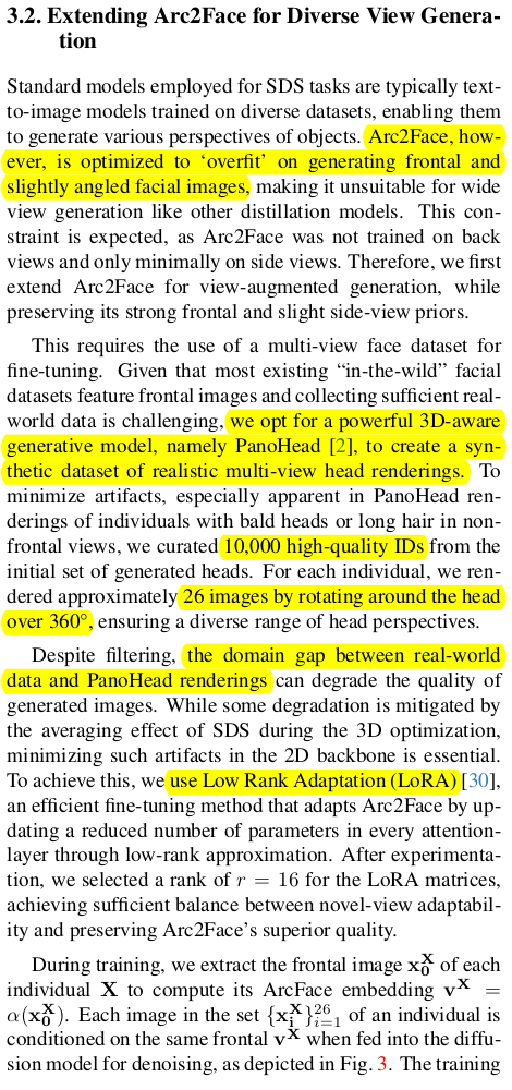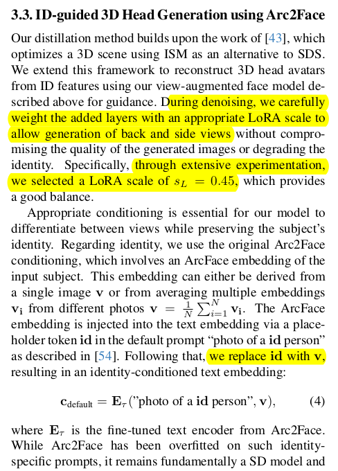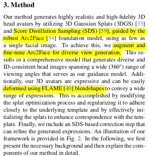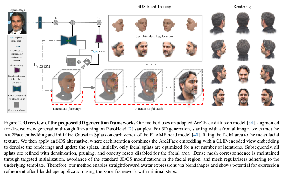 이 논문은 arc2face (얼굴 ID embedding으로부터 얼굴 이미지 만들어주는 SD)를 이용해서 3D animatable head를 만드는 논문. 핵심 아이디어는 FLAME 각 vertex마다 3D GS를 할당하고, ID embedding을 condition으로 주는 상태에서 "SDS" loss 만으로 학습시킨 점. text-to-3D에서 주로 쓰는 방법인데, arc2face가 text를 ID embedding으로 바꿔친 논문이다 보니 ID-to-3D가 가능해진 점을 바로 캐치하고 대입한 논문이라고 할 수 있다.