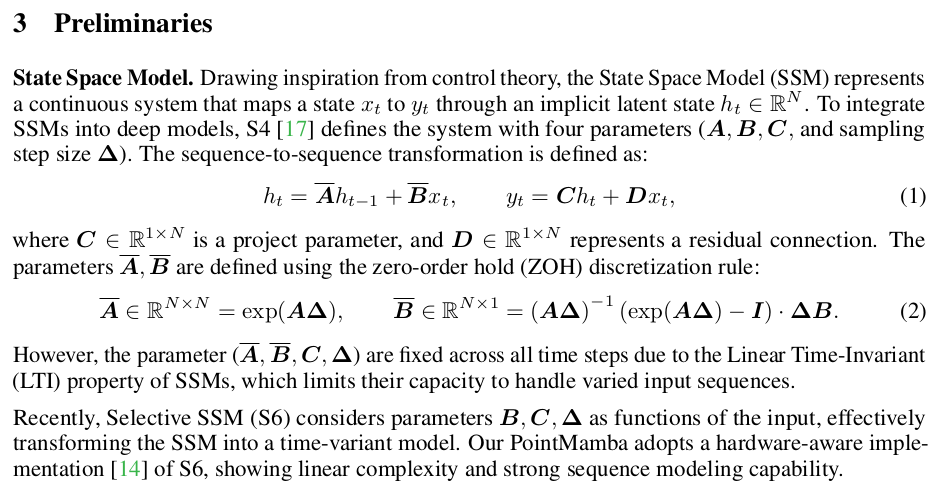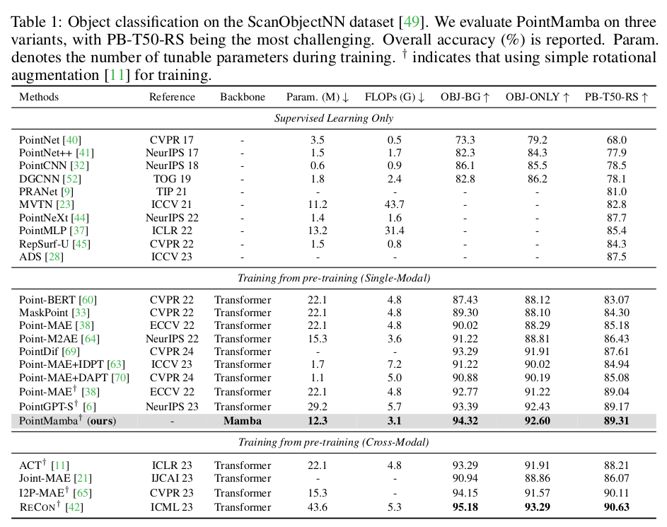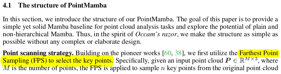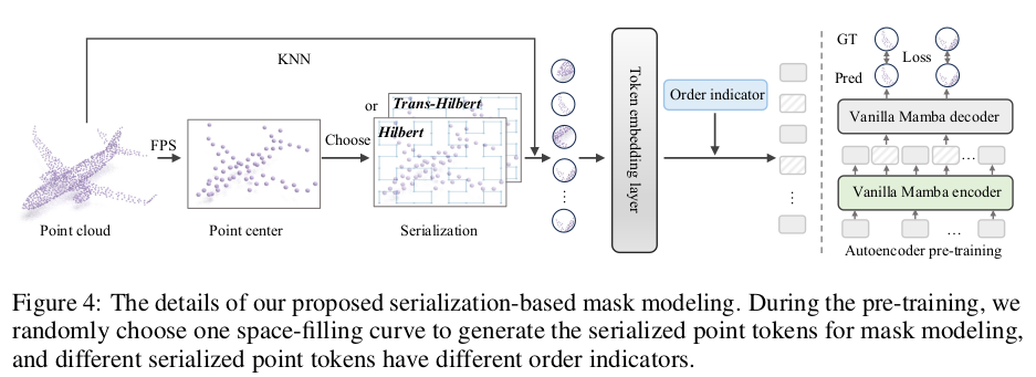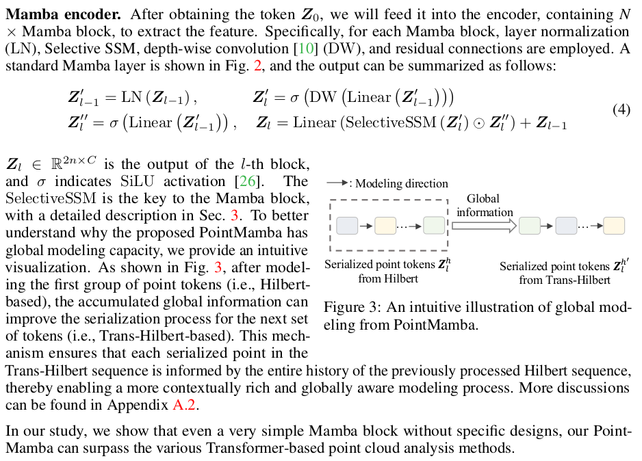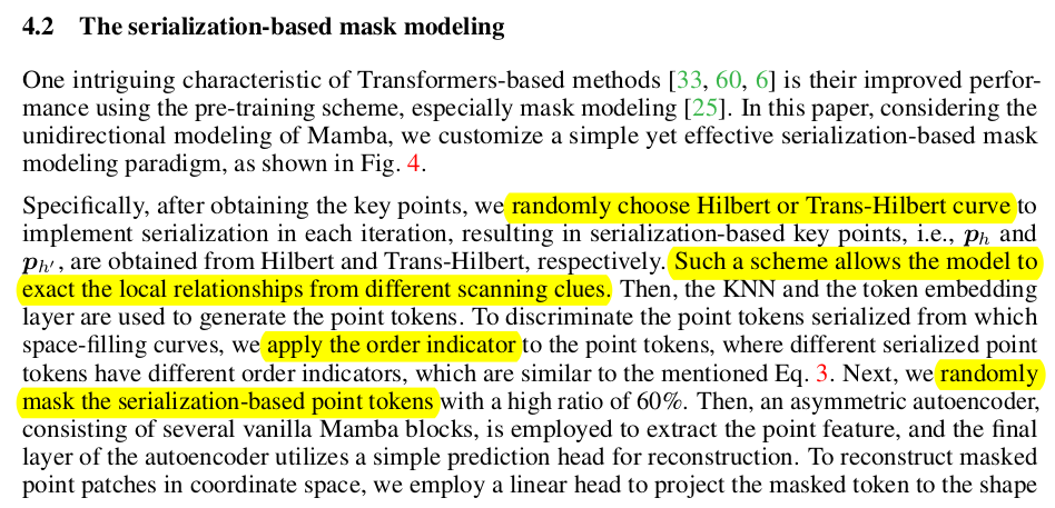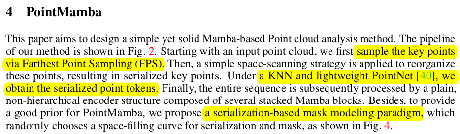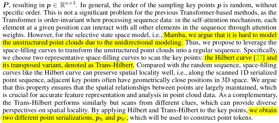 이 논문은 Point cloud에 transformer 적용하는 방법을 고민한 point-transformer나 point-MAE같이 Mamba 구조를 어떻게 point cloud domain에 적용할지 고민한 논문. mamba는 sequential 처리 능력을 가진 구조이다 보니 전후관계를 따로 모델링할 필요가 없는 transformer 대비 어떤 point cloud가 먼저고, 뒤인지 정의하는 것이 필수적이다. 3차원 열린 공간에서 point cloud의 "선", "후" 개념은 사실 존재하지 않기 때문에 저자들은 일정 규칙으로 연결하는 룰 하나를 제안하고 그 룰 대로 정렬한 뒤에 mamba를 통과시키는 구조다.