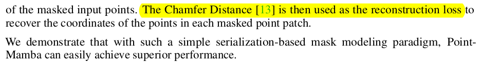 구조만 따라가고 요새 대세 MAE 방식으로 self-supervised training이 안되면 아무도 안 쓸 것. 그러나 transformer 구조랑 사실 크게 다를 바가 없다보니 그대로 적용 가능. ----- 특정 point KNN token을 마스킹하고 이를 다시 복원해내는 과정 chamfer distance 사용했다. |
