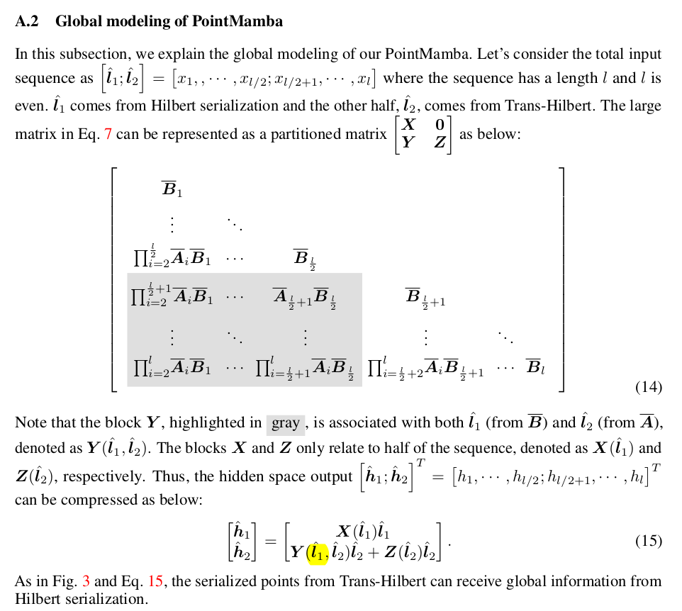 실제로 mamba 구조를 반복하면서 정보가 전달되는 과정을 수식으로 보면 최종적으로 trans-hilbert curve를 따라가면서 계산하는 과정에는 hilbert curve 에서 뽑은 feature 전체가 반드시 끼게 된다. |