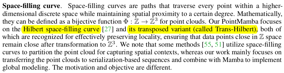 space filling curve는 마치 여러개의 점이 있을 때 이를 한붓그리기 할 수 있는 경로를 의미한다. 한붓그리기를 할 때 가까운 점은 먼저 연결되고, 먼 점은 나중에 연결된다는 조건을 충족시킨 형태라고 보면 된다. 당연히 해는 여러 개 존재할 수 있는데, 구현할 때 규칙을 어떻게 결정하느냐에 따라 정해진다. 아마 저자들이 구현할 때는 그림으로 보면, unit-cube 공간 자체를 지나가는 길을 하나 만들어 놓은 것 같다. point cloud 순서를 그때그때 계산하는게 아니라 공간에 정의해놓고, 그 공간 안에 들어오는 pointcloud를 연결하는 순서이지 않을까. trans-hilbert는 hilbert를 말그대로 transpose 한 것인데, 내가 생각하기론 (x,y,z) 순서의 point cloud를 특정 규칙으로 연결한 것이 hilbert면 (z,y,x) 순서로 point cloud를 뒤집고 같은 규칙으로 연결한 것이 trans-hilbert 인것 같다. 이렇게 한 이유는 vision mamba에서도 방향성 문제 때문에 row 방향으로 한번, col 방향으로 한번 인코딩하는 것처럼, 여기서도 무수히 많은 방향성 중 대표 2개는 동시에 사용하는 느낌. |