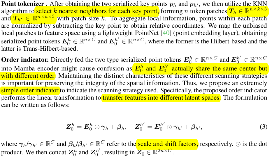 n x k x 3 point 들은 point net 작은 것을 통과해서 NxC의 point token이 됨. 그 다음 mamba에 들어 가기 전 순서가 다르지만 같은 정보라는 점에 착안해서, 두 경로로부터 나온 token들을 정렬하는 단계가 하나 있음. 같은 point 들을 순서만 다르게 정렬한 것이기 때문에 서로 linear mapping이 가능할 것이란 가정 하게 linear mapping layer를 하나 둔다. scale + trans 를 곱해주고 알아서 맞춰지길 기대. |