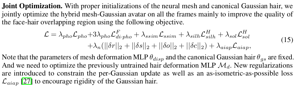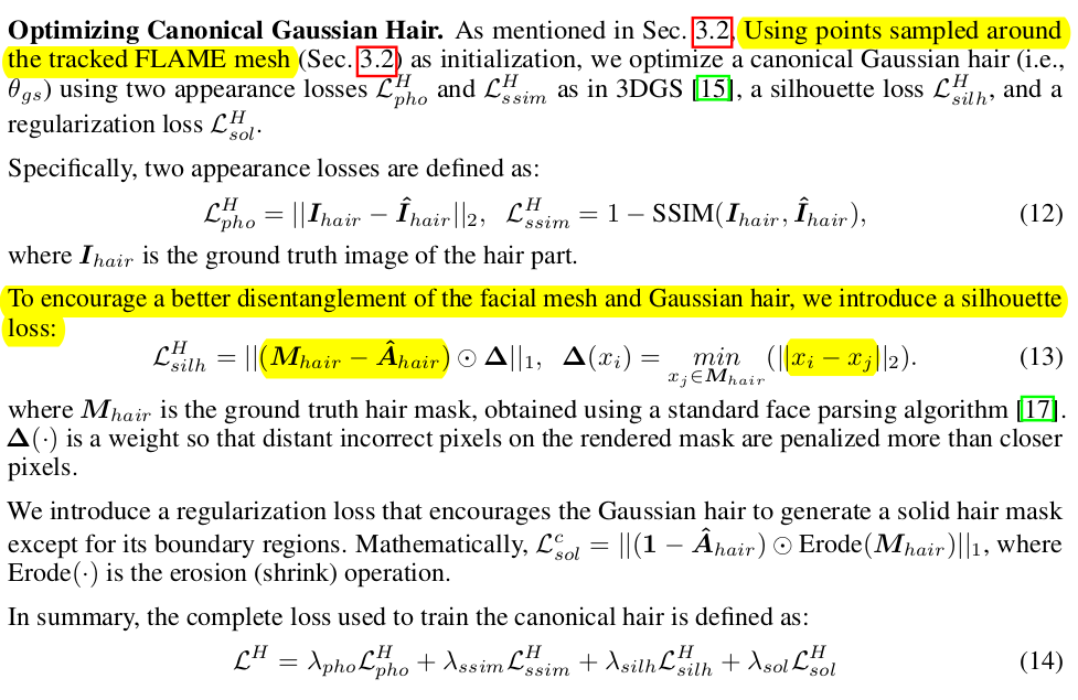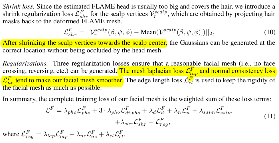 특히 hair gaussian을 저세상 위치로 발산할 수도 있다보니 hair gaussian들의 평균 위치에서 멀리 벗어나지 않도록, std가 작도록 억제. --- FLAME mesh에 binding된 형태니까 mesh에 걸 수 있는 regularization 다 걸기. |