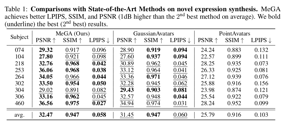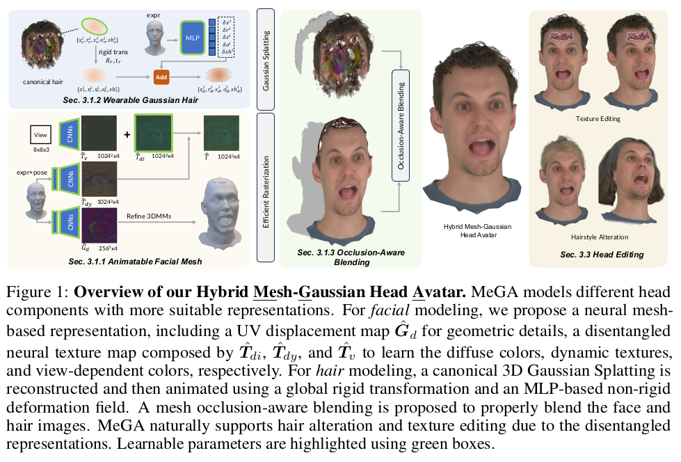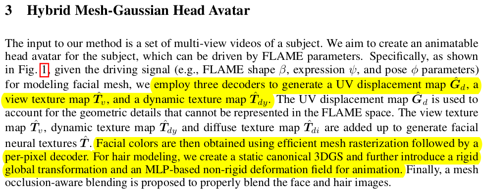 일단 전제 조건은 주어진 1객체마다 학습을 따로 한다는 점. 범용 모델은 아니다. subject A, B가 있으면 A, B 각각 학습하는 식. 1) exp+pose parameter 입력으로 받았을 때 subject-specific displacement map, texture map을 뽑아내는 decoder들을 학습함 ->UV domain 나중에 sampling해서 사용 2) sampling으로 만들어낸 값을 rendering 해서 3DGS 학습하는 방식 -> 얼굴, 비얼굴 영역 분할해서 따로 학습. |