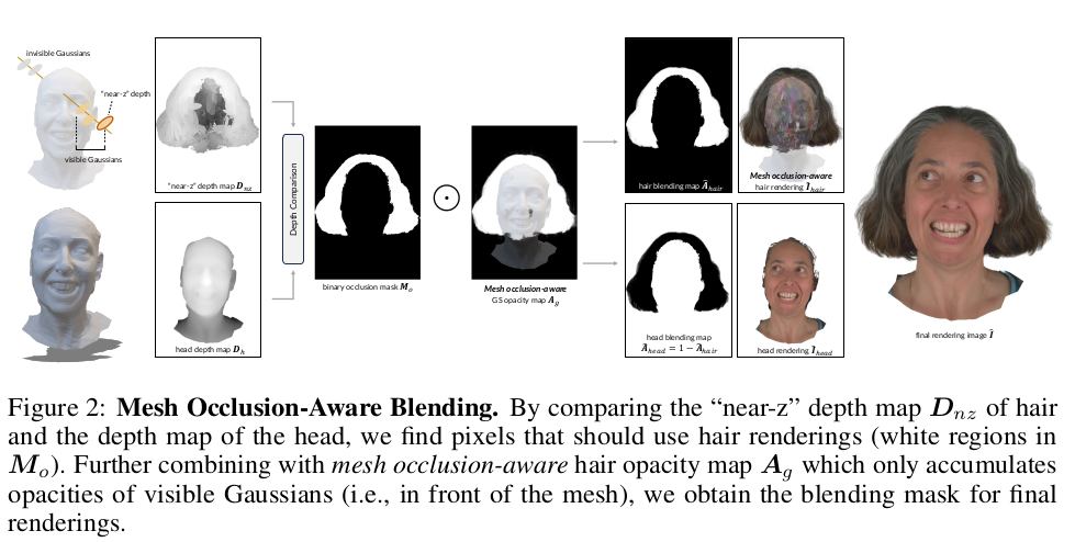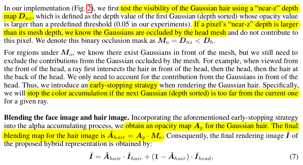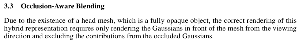 결과물을 렌더링할 때 얼굴과 머리카락 영역을 따로 하기 때문에 겹치는 부분 처리를 따로 해줘야 함. 다행히도, depth 값을 가지고 뭐가 앞서있는지 판단할 수 있기 때문에 자연스러운 blending이 가능. 한 시점에서 head+hair gaussian으로 렌더링을 시도할 때, early stopping으로 멈추는 방식. opacity가 충분할 때 멈춘다기 보다 이전 gaussian 대비 거리가 너무 멀다 싶으면 멈추는 방식 머리카락은 일반적으로 head에서 멀다는 가정. (앞머리 덮은 머리는 잘 안될 가능성이 있어 보임) -> 이렇게 해서 blending mask를 미리 모든 픽셀에 대해 계산해둔 뒤, -> 나중엔 각각 렌더링하고 더하기. |