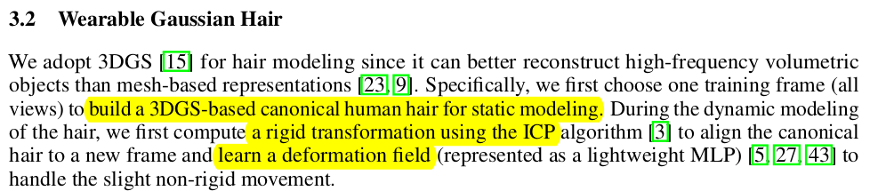 초기화가 완료되면 일단 3DGS 학습 그리고 frame 간에 ICP로 tracking하는게 기본 약간의 변형은 expression-conditioned MLP를 추가해서 residual을 저장하도록 함. MLP로. |