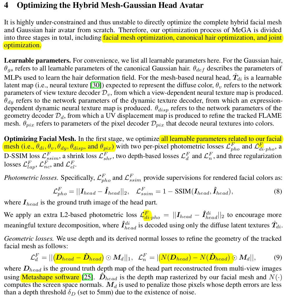 학습할 게 많다. 1) 처음엔 얼굴 영역에 대해서 3DGS를 photometric loss, ssim으로 학습하는 것에 집중 이 때 diffuse color만 사용해서 렌더링 한 이미지도 loss 계산할 때 넣어줘서, diffuse color가 주도적으로 색상을 결정하도록 유도하고 나머지가 conditioned effect를 만들도록 함. 3DGS 위치를 업데이트하는 과정에서는 Agisoft로 만든 depth를 가지고 depth loss 추가해서 geometry를 벗어나지 않도록 억제함 -> photometric loss 만으로는 noise가 심했을 거라고 생각했는데 depth를 썼구나. |