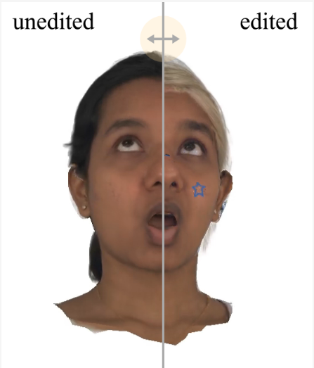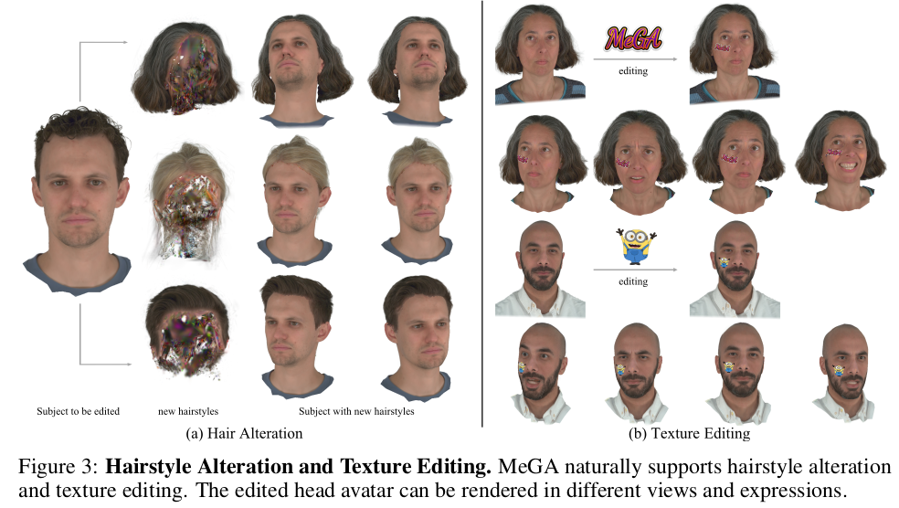 많은 사람들이 썸네일보고 가장 궁금했을 editing 파트 1) hair change는 단순하게 hair랑 다른 사람 head 간에 ICP로 정합하는 과정으로 끝남. 자연스럽게 얹어놓는 느낌. -> 얼마나 hair gaussian이 hair만 경계따라 잘 학습했는지가 중요함. 2) texture editing은 UV domain의 texture map이 있다보니 해당 위치에다가 그림을 넣어놓으면 됨. |