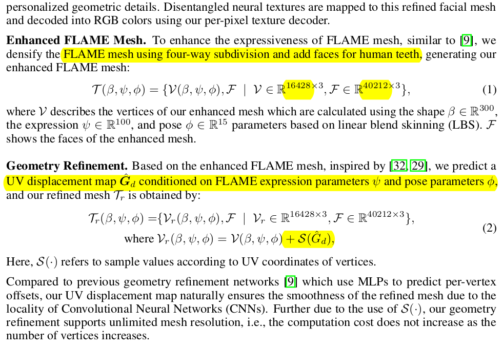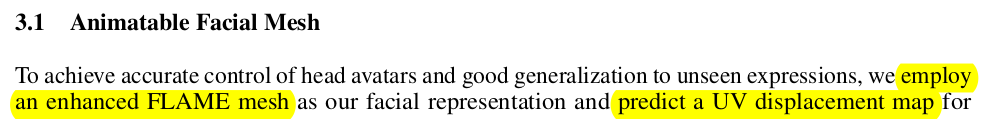 얼굴 영역 먼저, 얼굴은 deformable이라고 가정. FLAME 파라미터로 컨트롤 되도록 모델링 FLAME을 1번 subdivision하고 치아 영역 따로 추가했다고 함. FLAME 피팅 결과가 있지만 표현력의 한계가 있으므로, 더 subject에 맞는 geometry를 얻기 위해서 displacement map을 learnable로 열어두고 학습 ->3DGS가 photometric loss에 의해 이동하는 양이 UV domain displacement map에 기록되는 구조. FLAME parameter -> CNN -> per-pixel MLP 구조. |