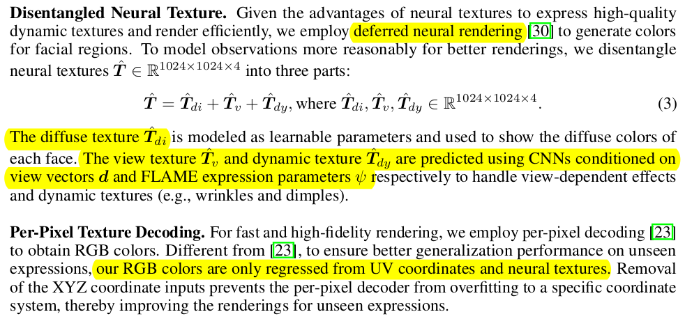 자연스러운 색상을 위하여 color RGB만 두지 않고, Diffuse color map, view-dependent color map, expression-dependent color map 3개를 또 따로 학습 -> displacement map 학습하는거랑 원리가 같음. |