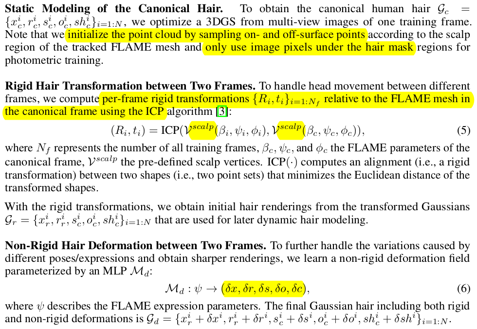 머리카락 영역은 기본적으로 static으로 가정. 약간의 deform만 있다고 생각하는 편. FLAME vertex를 기본으로 위치 초기화하고, off-surface에서 조금 더 sampling해서 추가. (두피에서 먼 점도 필요하니까) 대신 off-surface도 막 뽑느게 아니라 ID 부여해서 하고 densification은 막은 느낌. |
