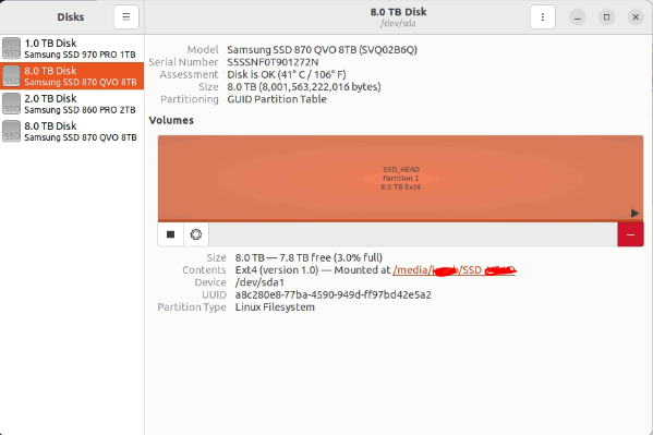 disks를 켜보면 unmount되어 있는 디스크가 보일 것인데, GUI 상에서 - 버튼 + format을 하는 것이 안전하다. fdisk를 써서 하나 하나 작업할 수 있지만 뭐 하나 잘못 입력했다간 실수로 다른 디스크도 날릴 수 있기 때문에 GUI에서 하는 것을 추천