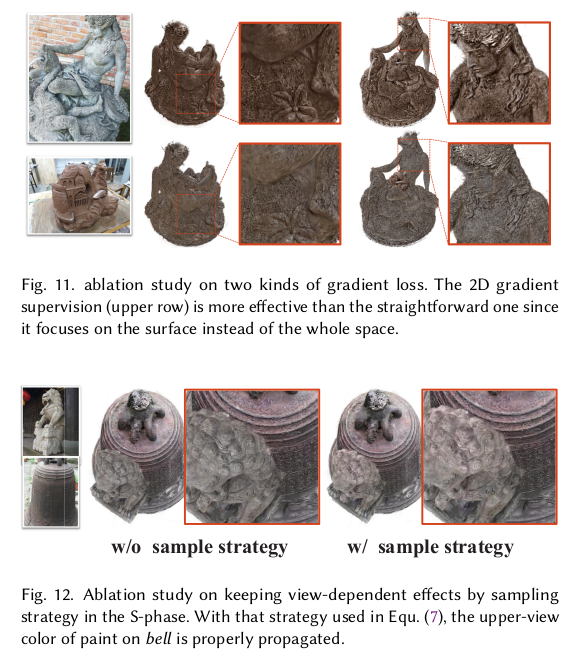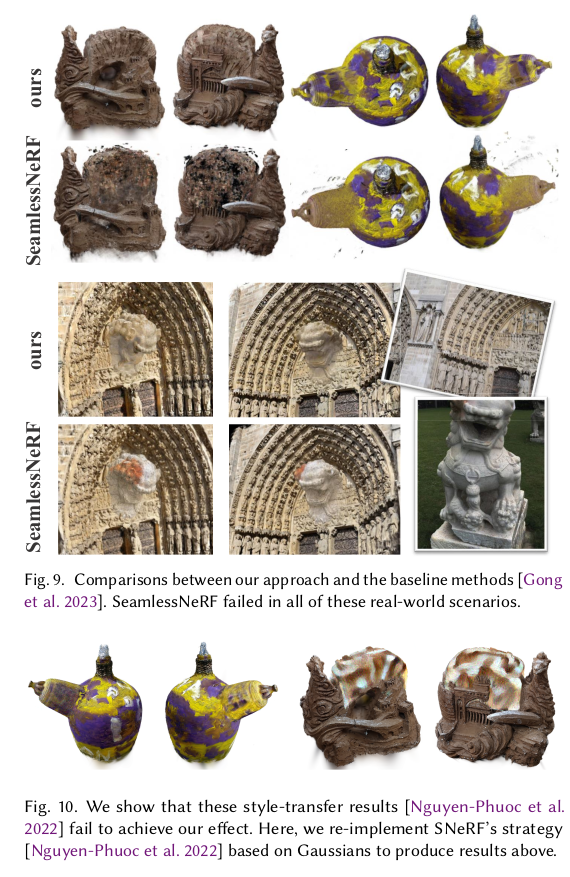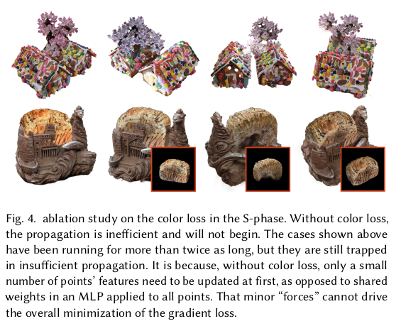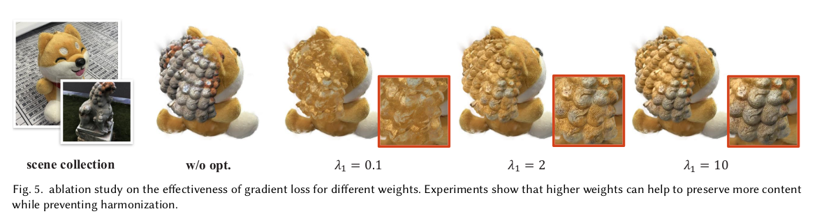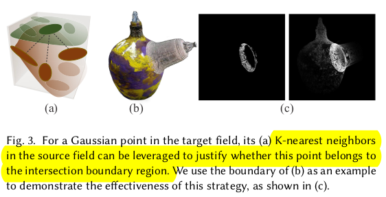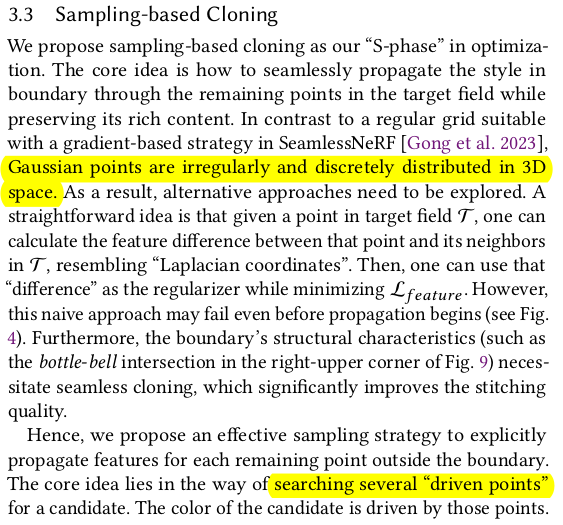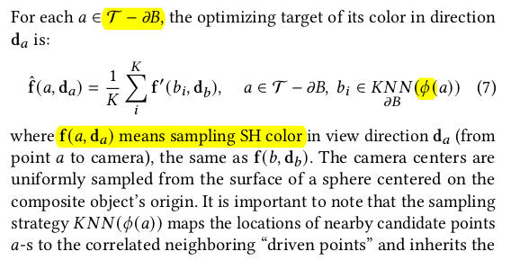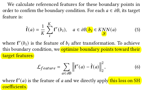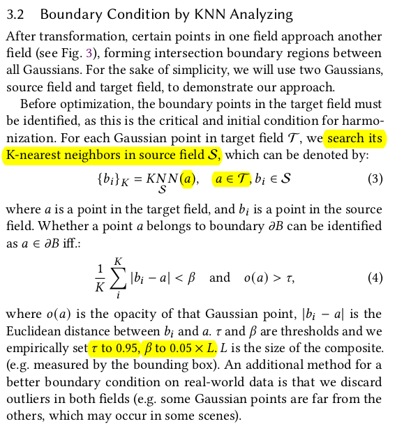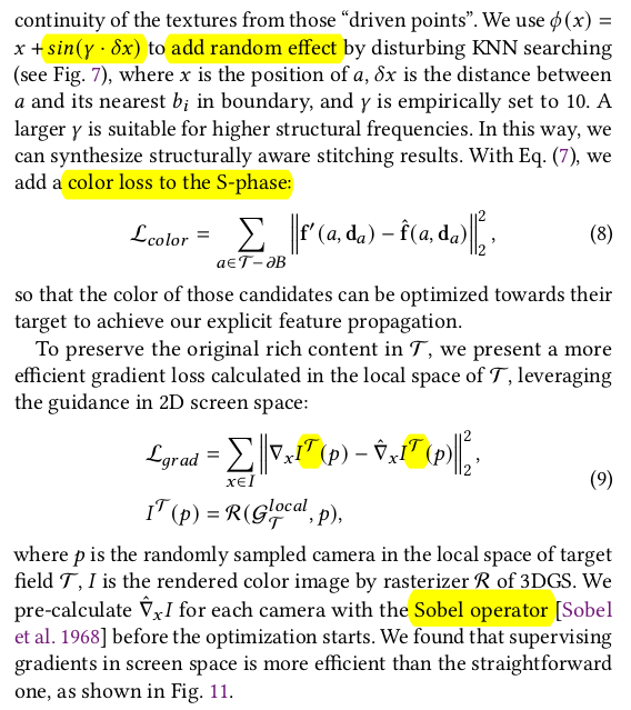 대상 영역이 그럴듯하게 합쳐지긴 하지만 나머지 부분은 전혀 핸들링이 안됨. 접합부에서 거리가 먼 영역은 원본 그대로 남아있기 때문에 이상할 것 따라서 먼 거리에 있는 3DGS들도 손을 대긴 해야 한다. 그 방식은 1) driven points를 몇개 뽑아서 (sampling) 해당 point a에서 N point B를 matching -> 이 때 point a는 접합부 외 영역 (먼 거리) -> 샘플링 할 때 정확히 point a 위치를 사용하면 항상 matching 되는 애만 매칭되고, 핸들링 안되는 애들이 생길 수 있으니 nearest matching 할 때 point a 위치를 random 하게 흔들면서 매칭 2) N point b의 SH color (view dependent color)를 avarage 3) point a의 SH color와 L2 최적화 ----------------------- SeamlessNeRF에서도 색상으로만 업데이트했을 때 seam이 안사라지는 것을 봐서, gradient를 사용하는 term도 추가 1) 렌더링된 이미지에 sobel filter를 먹임 2) 원본 (합치기 전) 대상으로 렌더링한 이미지에 sobel filter를 먹임 3) 이 둘 간의 오차를 l2 최적화 -> 원본의 경계, 굴곡을 유지하도록 강제하는 셈. -> 생각보다 굉장히 간단하고 직관적. ![]() |