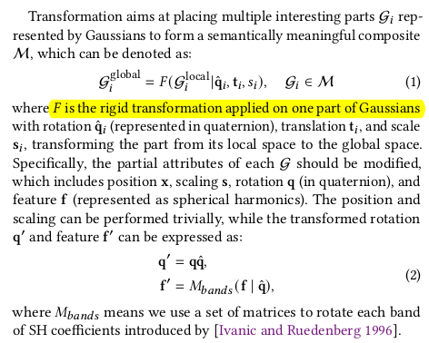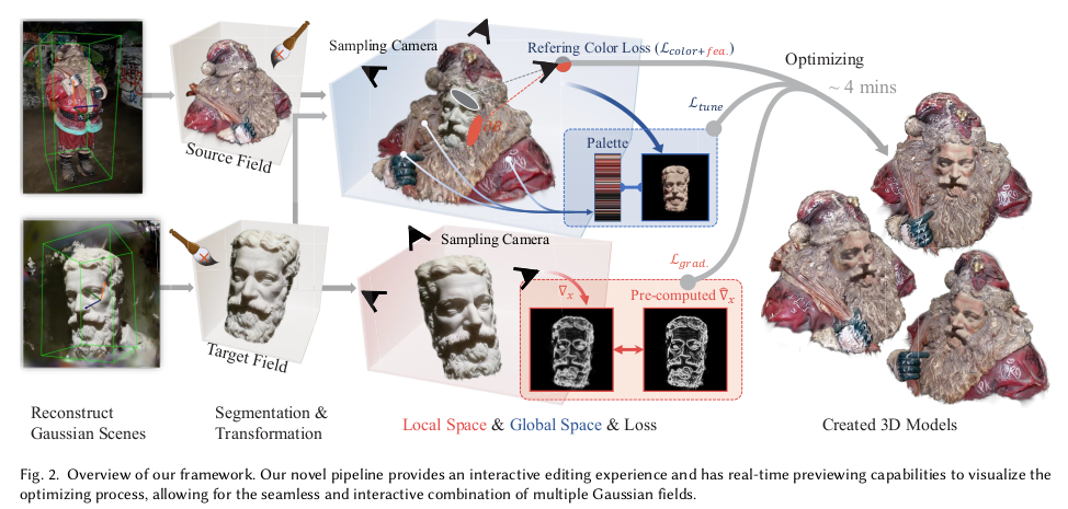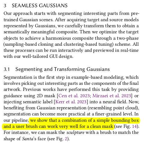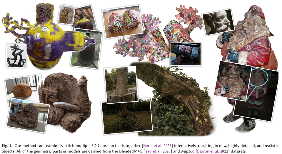 이전 SeamlessNeRF의 3DGS 버전이라고 보면 된다. SeamlessNeRF가 잘 학습된 TensoRF 모델을 위치를 지정해서 merging하는 방법론. NeRF보다 3DGS는 explicit하기 때문에 딱봐도 더 난이도가 낮아보이고 성능도 더 뛰어날 것으로 보인다. 단순히 color tone만 matching하는 것을 넘어서 gradient를 사용하는 컨셉을 그대로 가져오되 형식을 3DGS에 맞도록 변경한 것이 핵심.