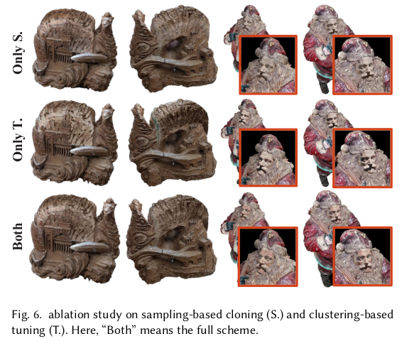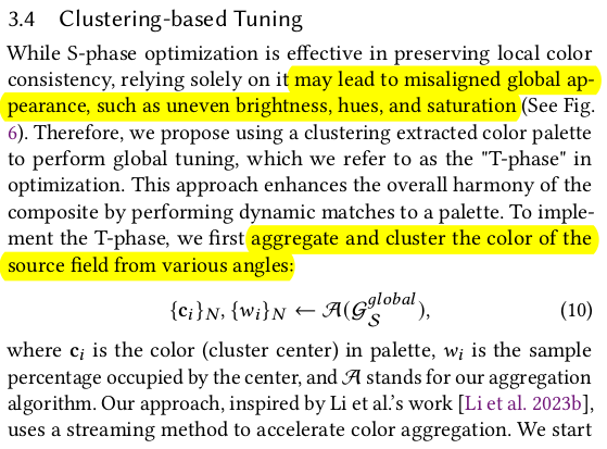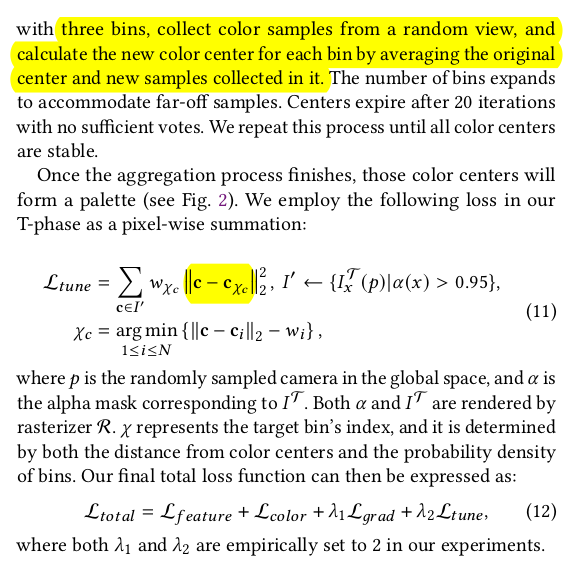 여태까지 SH coefficient, color 같이 SH만 주로 다뤘고, gradient term도 주로 position에 관여하는 loss이기 때문에 미묘한 색상 톤을 맞추진 않는다. 따라서 색상 톤을 직접 loss로 걸어서 업데이트 한 번 더 해줌 1) 기준이 되는 대상의 3DGS들에서 색상 팔레트를 추출 -> 처음에는 3개 뽑고, clustering하며서 center 늘려가듯이 점진적으로 추가 2) 업데이트 대상 3DGS들의 color마다 nearest matching로 색상 팔레트에서 찾음 -> 최적화 |