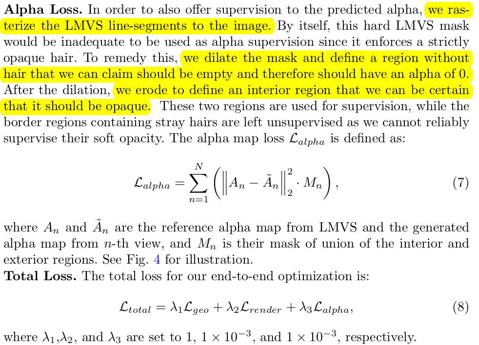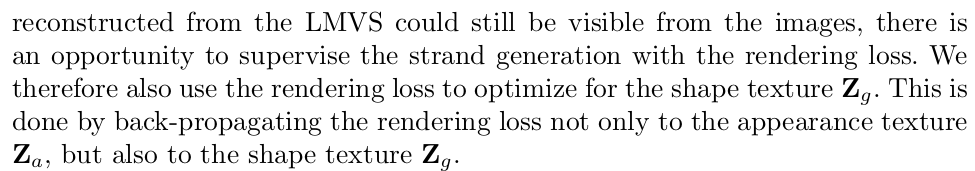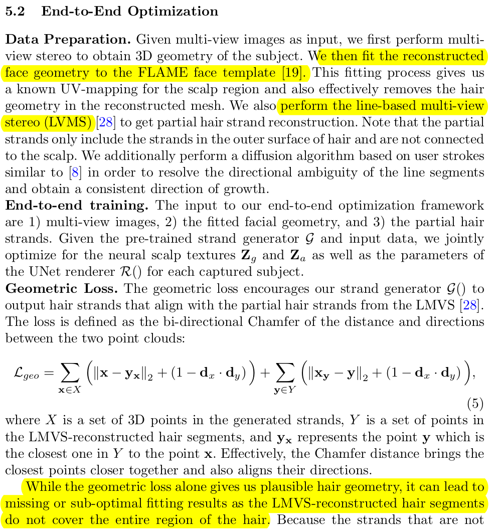 학습 GT가 있어야 된다. 근데 문제는 synthetic말고는 사실 만들 수가 없다는 것. LVMS 남길주 박사님의 CVPR2019논문으로 line based MVS를 통해서 머리카락을 일단 복원한다. -> visible region만 복원 가능하고 -> hair가 두피까지 연결되어 있지 않고 국소적으로 끼리끼리 연결되어 있는 약간 선 다발 정도로 복원됨 이 데이터가 약간 pseudo GT처럼 사용된다 일다.ㄴ ---- 네트워크 출력으로 decoding한 hair strand랑 LVMS로 복원한 hair strand 간의 nearest neighbor를 찾는다. 그다음 그 neighbor와의 거리, 각도가 유사하도록 최적화하는 것이 핵심 loss --- 아래 언급했듯이, 이걸 sub-optimal하기 때문에 완벽한 loss는 아니다. |